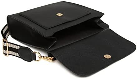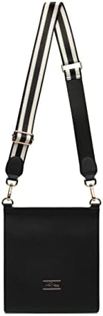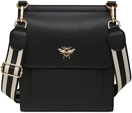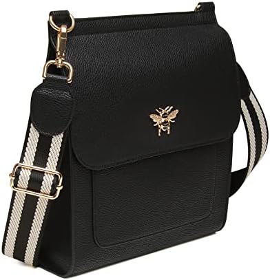 A wardrobe essential, classic crossbody bag with a gold bee fitting and a funky strap