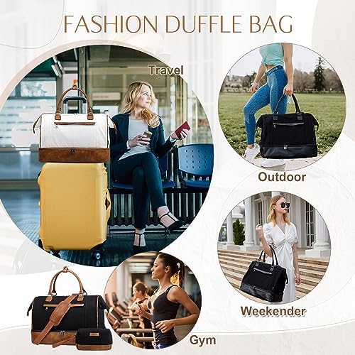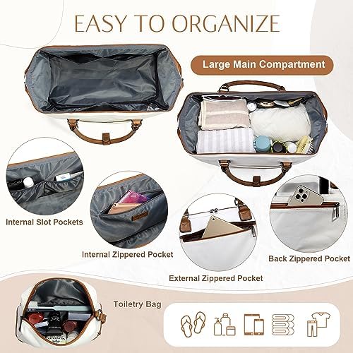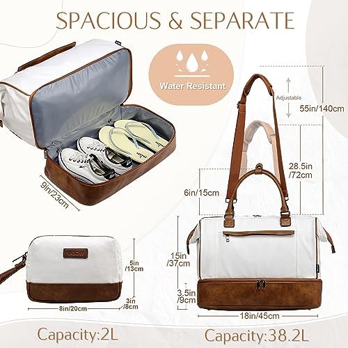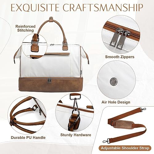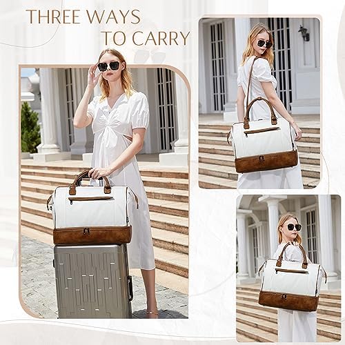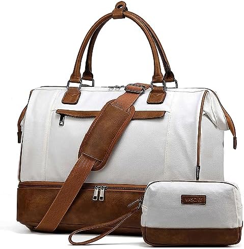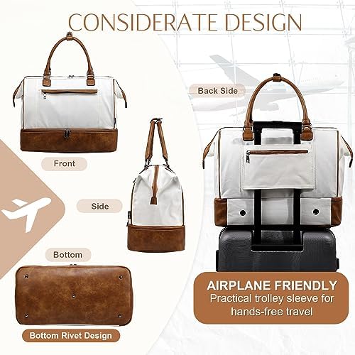 Travel Duffle Bag for Women,Vaschy 17” Canvas Under Seat Carry On Weekend Overnight Duffel Tote Holdall Bag with Trolley Sleeve/Shoe Compartment/Tolietry Bag Set for Travelling,Gym Beige
